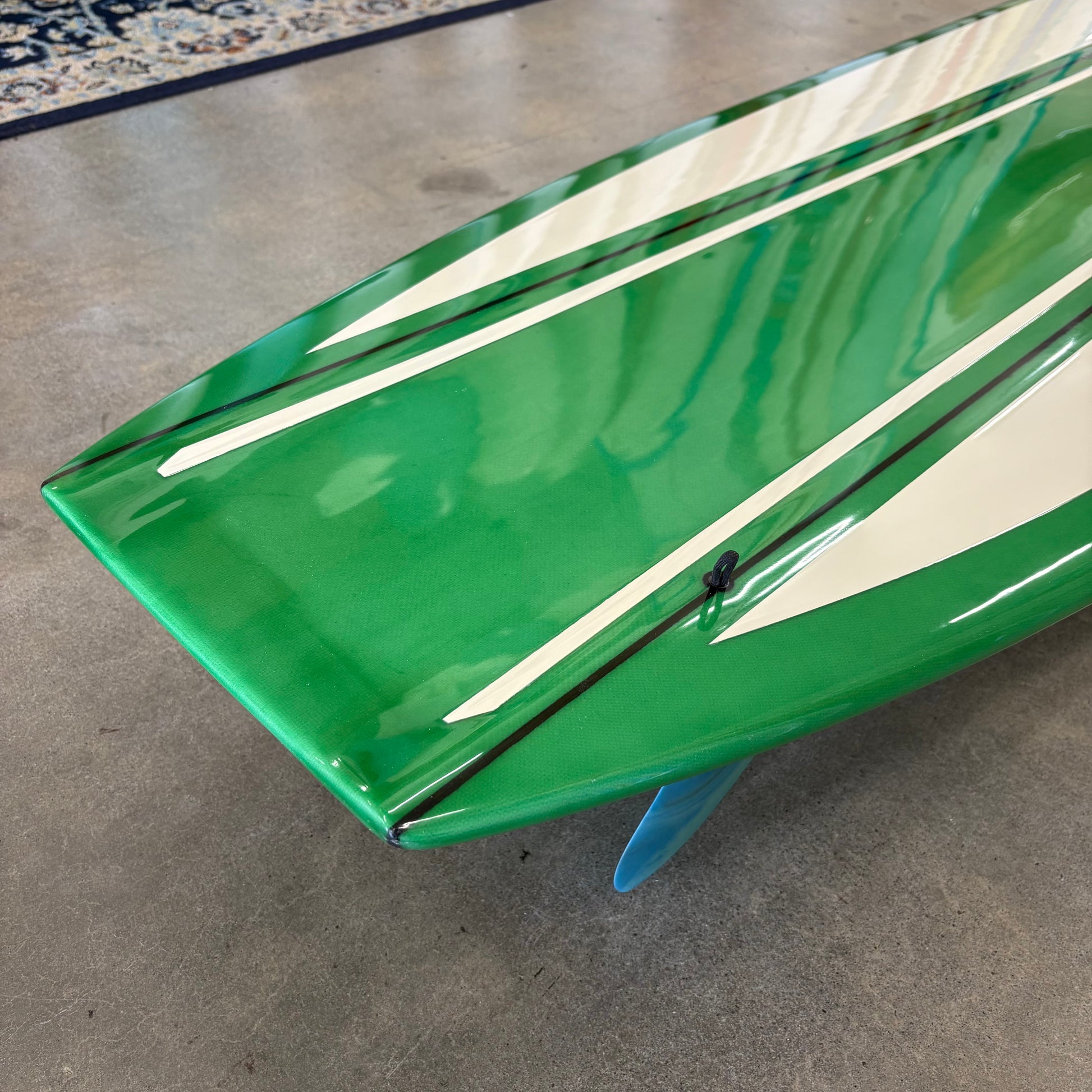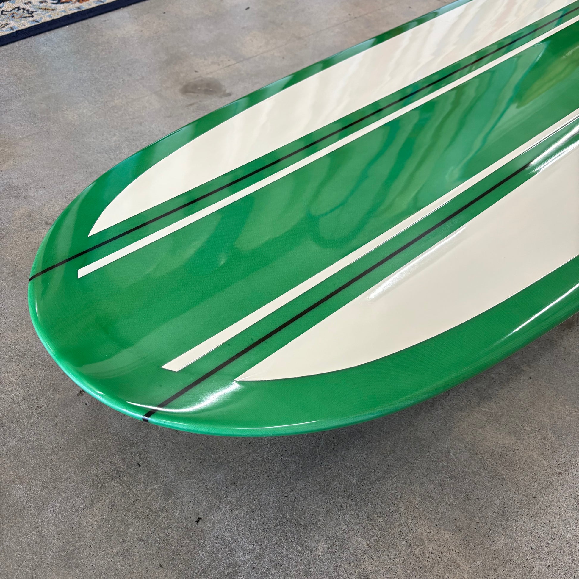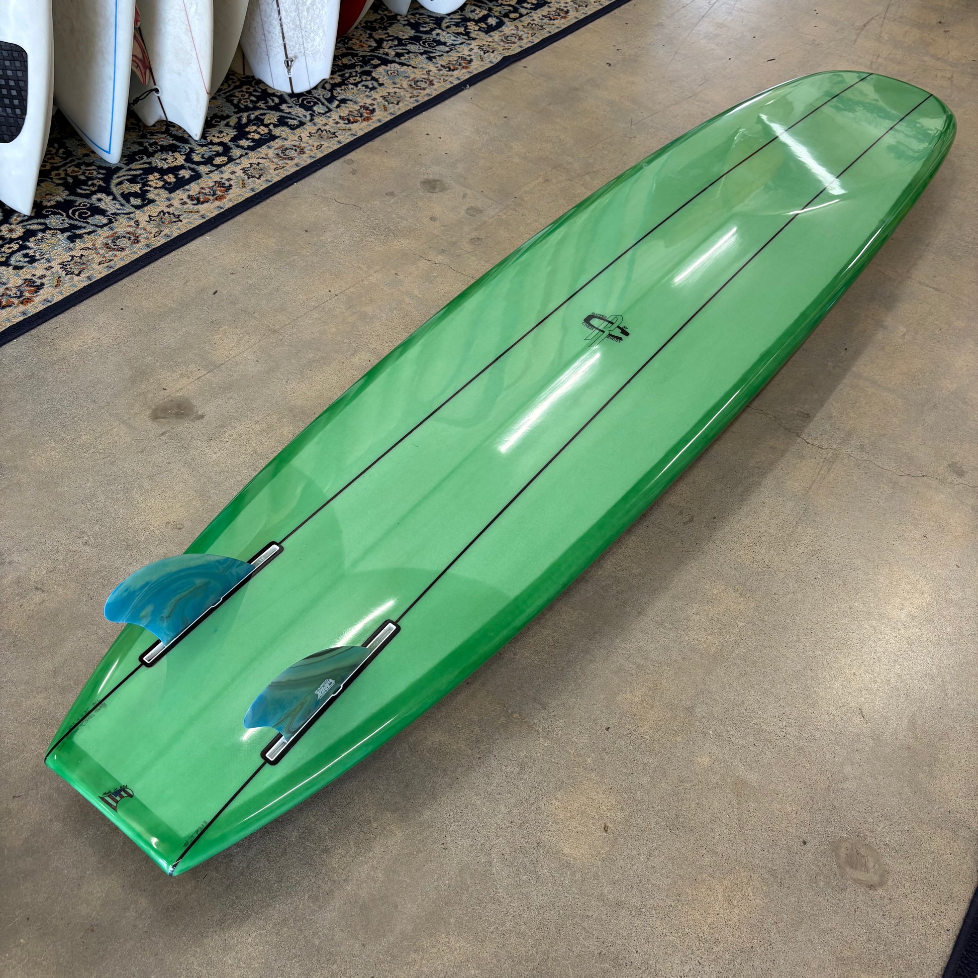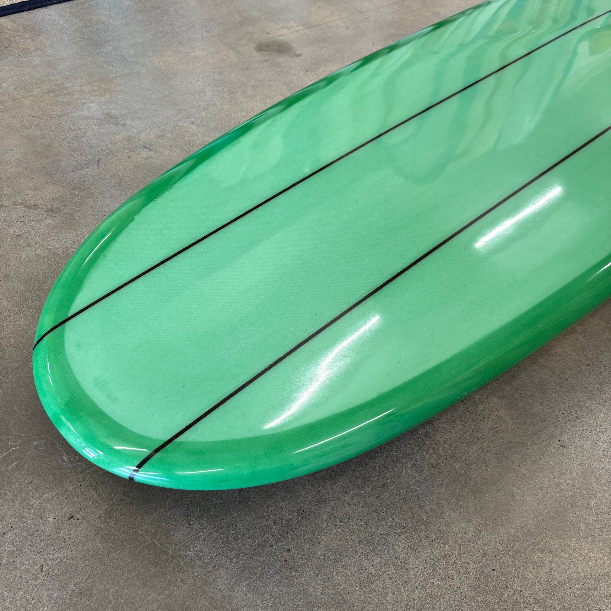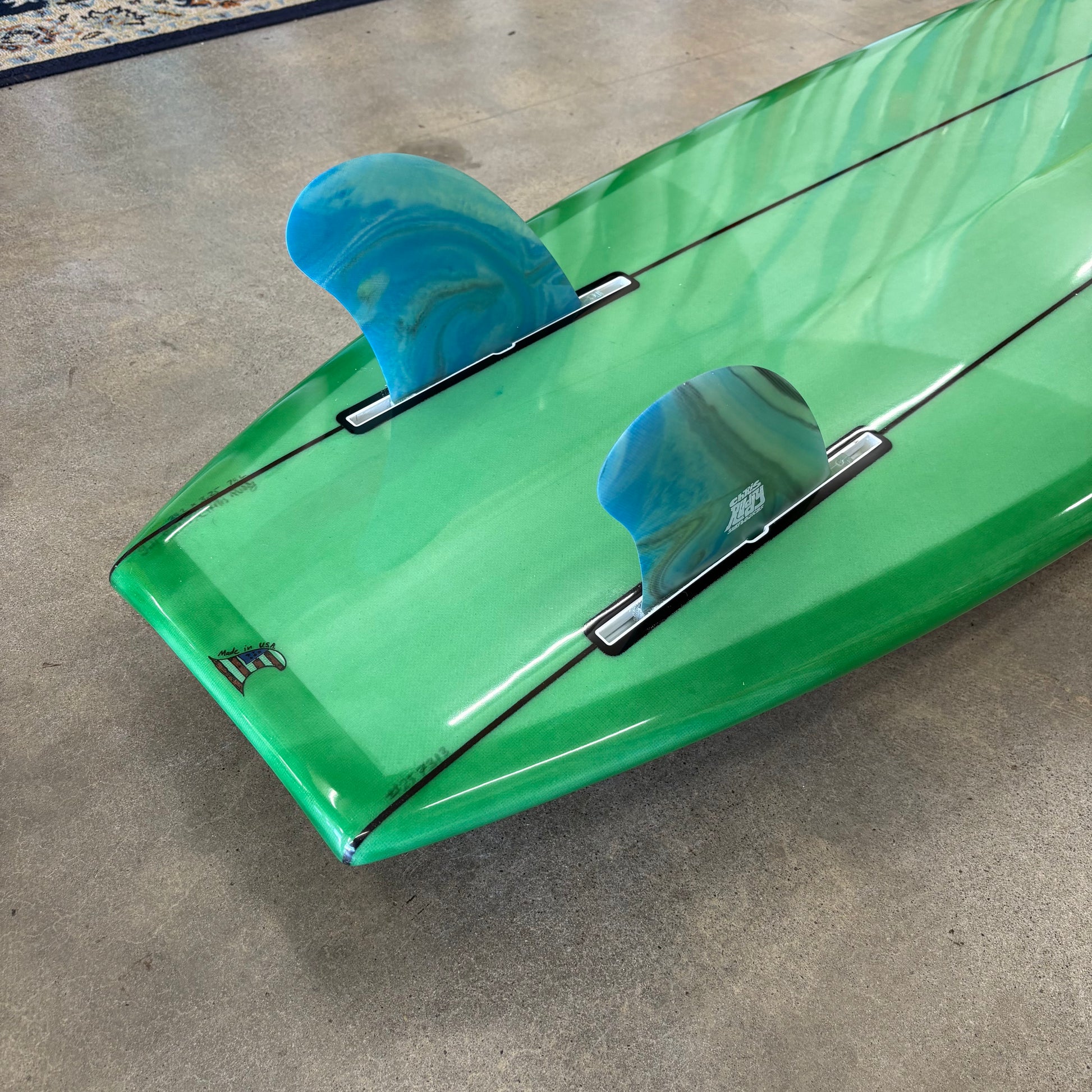 A continuation of one of the most important surfboard design tracks to date, the Simmons two-fin planing board, this 50/50 railed log features twin mini-D fins, framing a flat plane which blends into deep vee through the mid section and into nose concave up front. The result is a traditional feeling longboard which trims, fades, and noserides like a traditional classic, but turns and climbs the face like nothing I've ever surfed before this. It will hold the most aggressive cutback you can throw at it, and will complete your turn with more speed than any old school longboard I've ever ridden. [If you could add NOS to a longboard, this would be the result.]