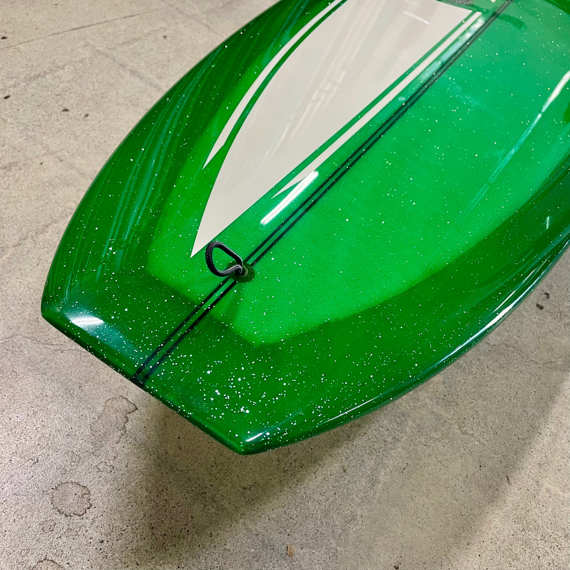 9’5 Green Sting-Ray Banana Seat, Green resin tint metal flake 6oz glass. T-band stringer, glassed in all 6oz. Single fin box, mild concave nose with a square tail.